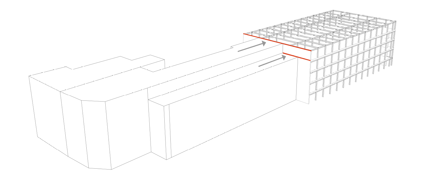 Das Gebäude beträgt die Maße 51,50 x 26,80 Meter. Das Tragwerk besteht aus einer Skelettbauweise und einem tragenden Treppenkern.