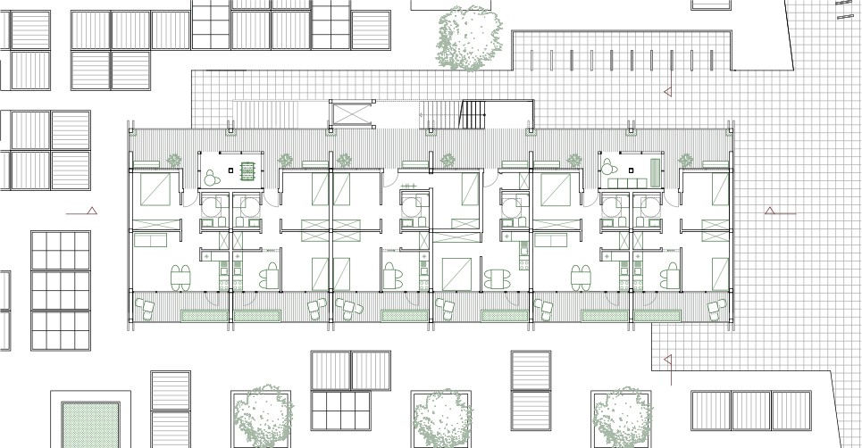 Der Laubengang dient als Erschließung, Begegnungsort und Ort zum Verweilen. Alle Wohnungen besitzen eine Loggia mit intigrietem Hochbeet zum eigenen Anbau.