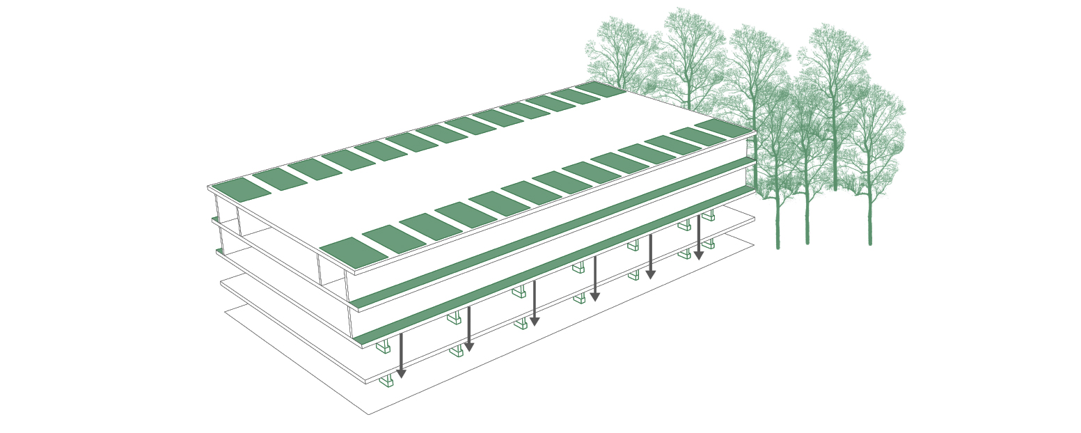 Das Gebäude ist durch das sehr begrünte Grundstück von Natur umschlossen. Die Bestandsbäume und die Biodiversität, die sich neben dem Gebäude befindet, generieren die Artenvielfalt und Urbanität. Dieses Grün zieht sich durchs Gebäude und ist durch die begrünten Schächte, Pflanzen auf den Balkonen und Urban Gardening auf dem Dach wiederzufinden.